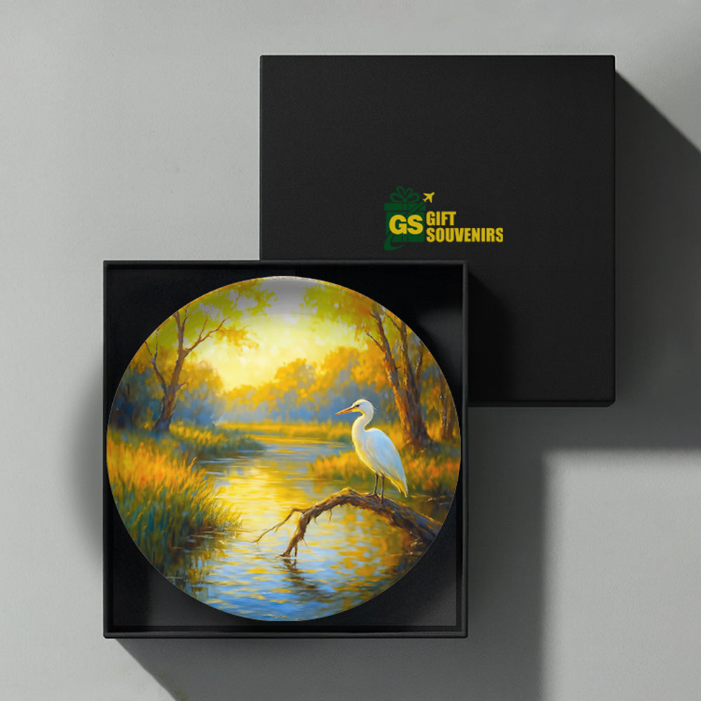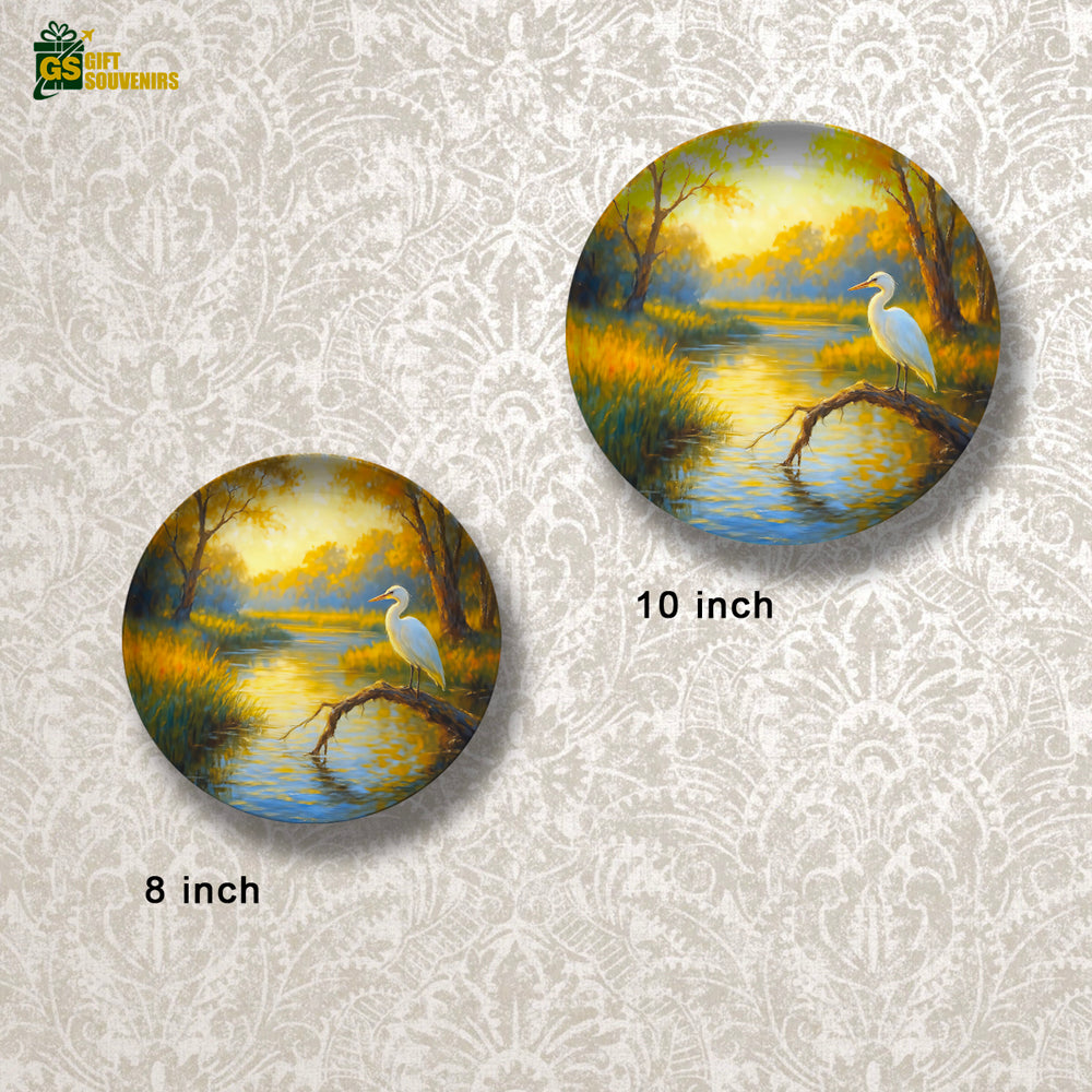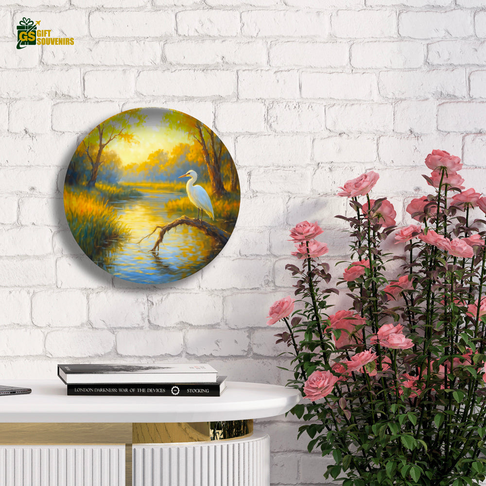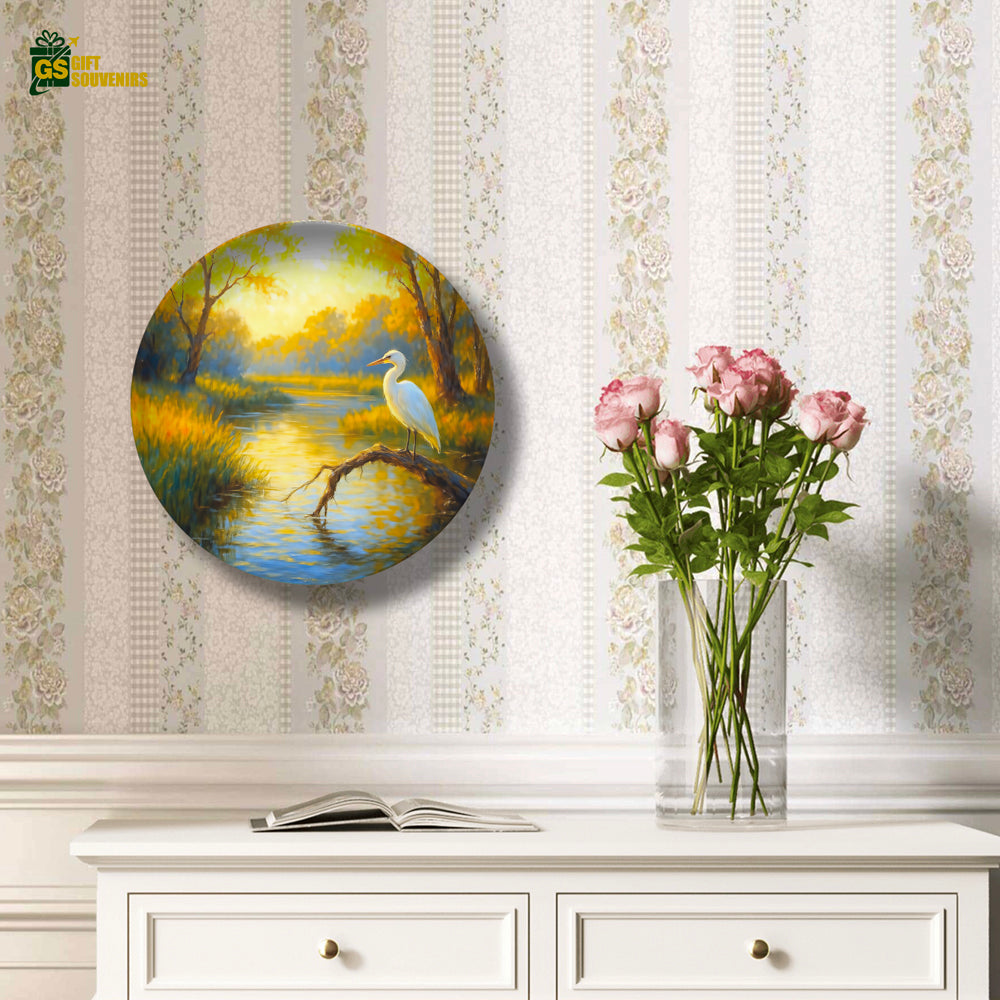 Bring the gentle wisdom of nature into your space with Dawn of Stillness, a serene wall plate artwork that captures a graceful bird resting by a golden stream under the soft morning light. In many cultures, such birds symbolize patience, clarity, and spiritual awakening — reminding us to pause, reflect, and move forward with purpose.