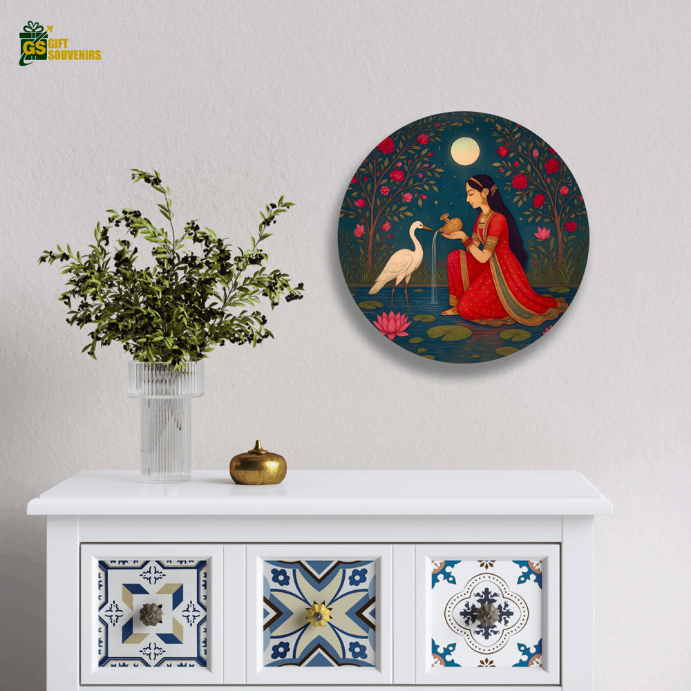 Step into a world of timeless beauty and serene devotion with Divine Stillness, an exquisite wall plate inspired by the elegance of traditional Indian art. Bathed in soft moonlight, the scene portrays a graceful woman offering water amidst lotus blooms and gentle nature — a poetic reflection of balance, spirituality, and harmony deeply rooted in Indian cultural traditions.