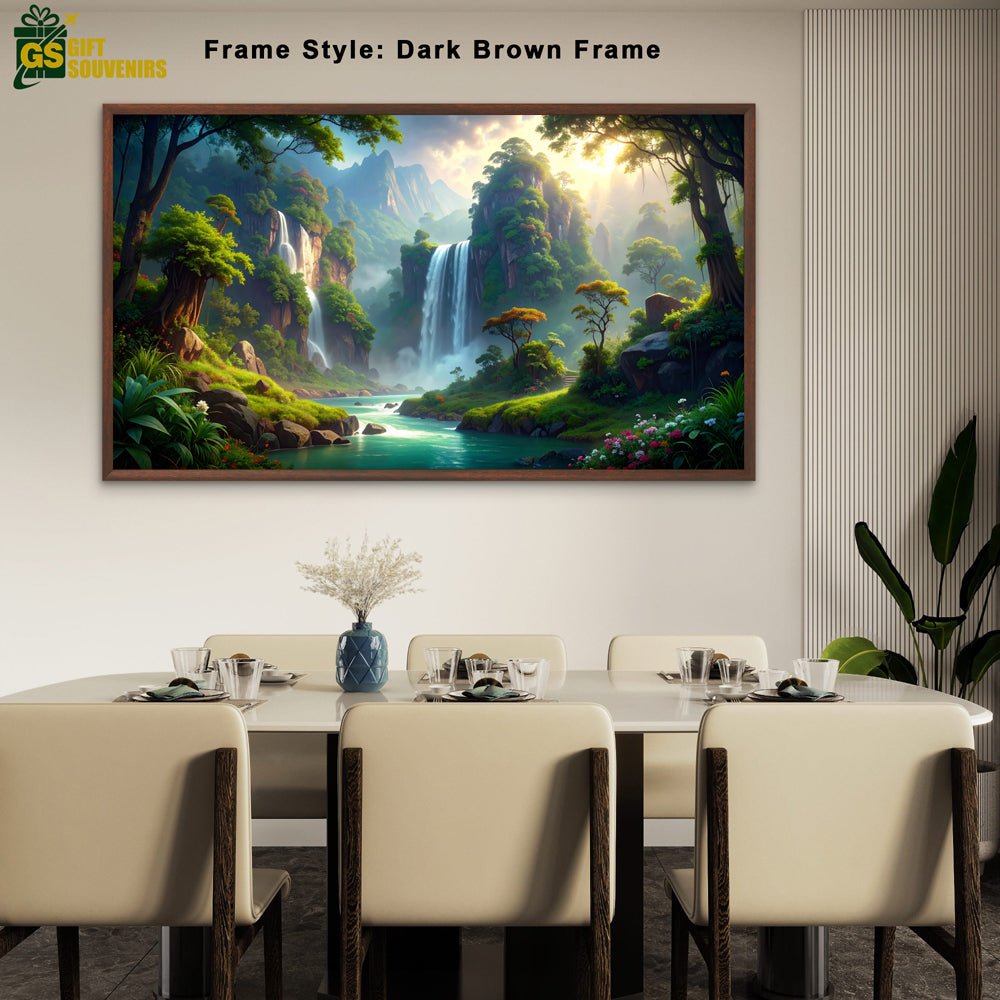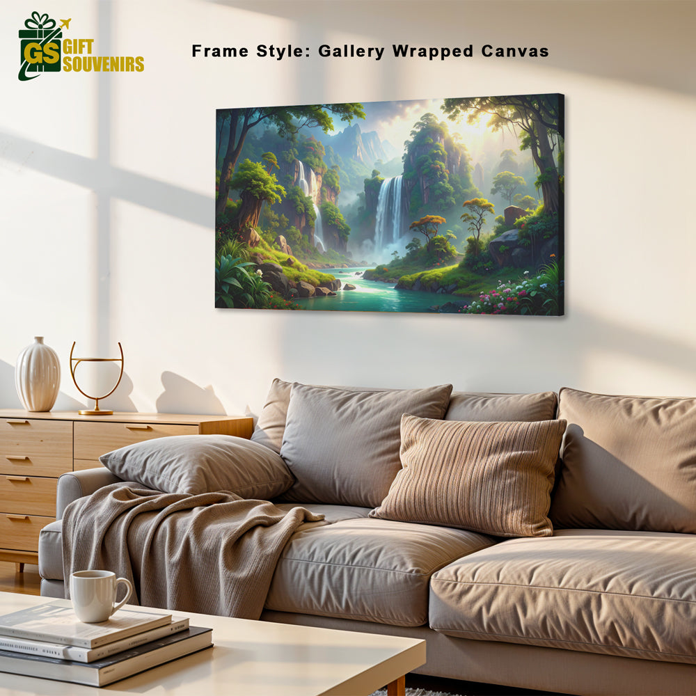 A breathtaking landscape of cascading waterfalls flowing through a lush green paradise. Soft sunlight and misty cliffs create a calming sense of depth and harmony. The tranquil river and vibrant foliage bring nature’s serenity indoors. Ideal for peaceful and refreshing interior spaces. Printed on premium canvas for a rich, gallery-quality finish.