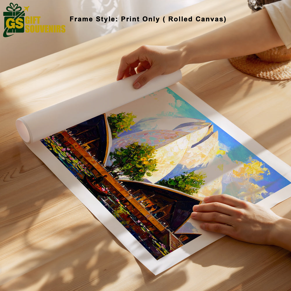 Inspired by the iconic Lotus Temple of India, this artwork symbolizes unity, peace, and spiritual balance. The lotus-shaped architecture rises gracefully amid water and greenery, reflecting calm and harmony. Soft pastel skies and warm tones add depth and serenity to the composition. A refined piece for soulful and elegant interiors. Printed on premium canvas for a rich, gallery-quality finish.