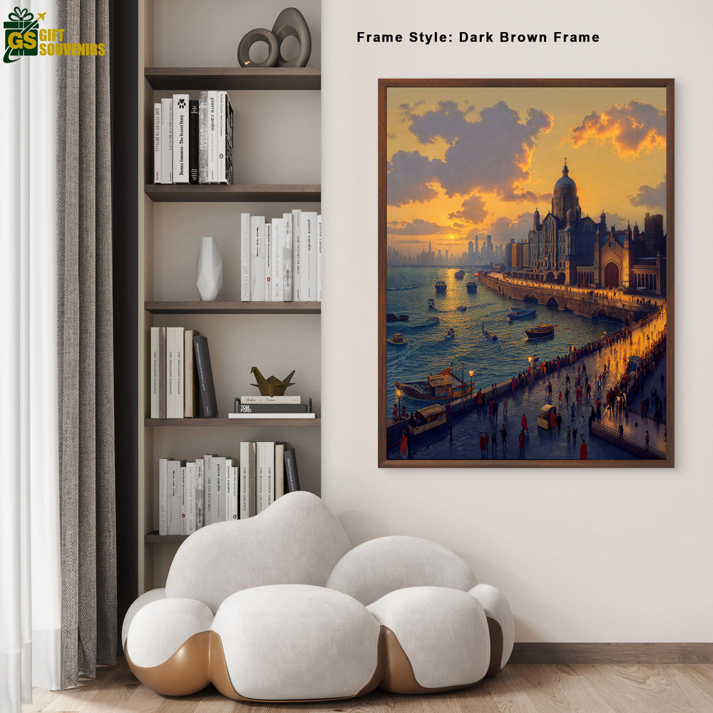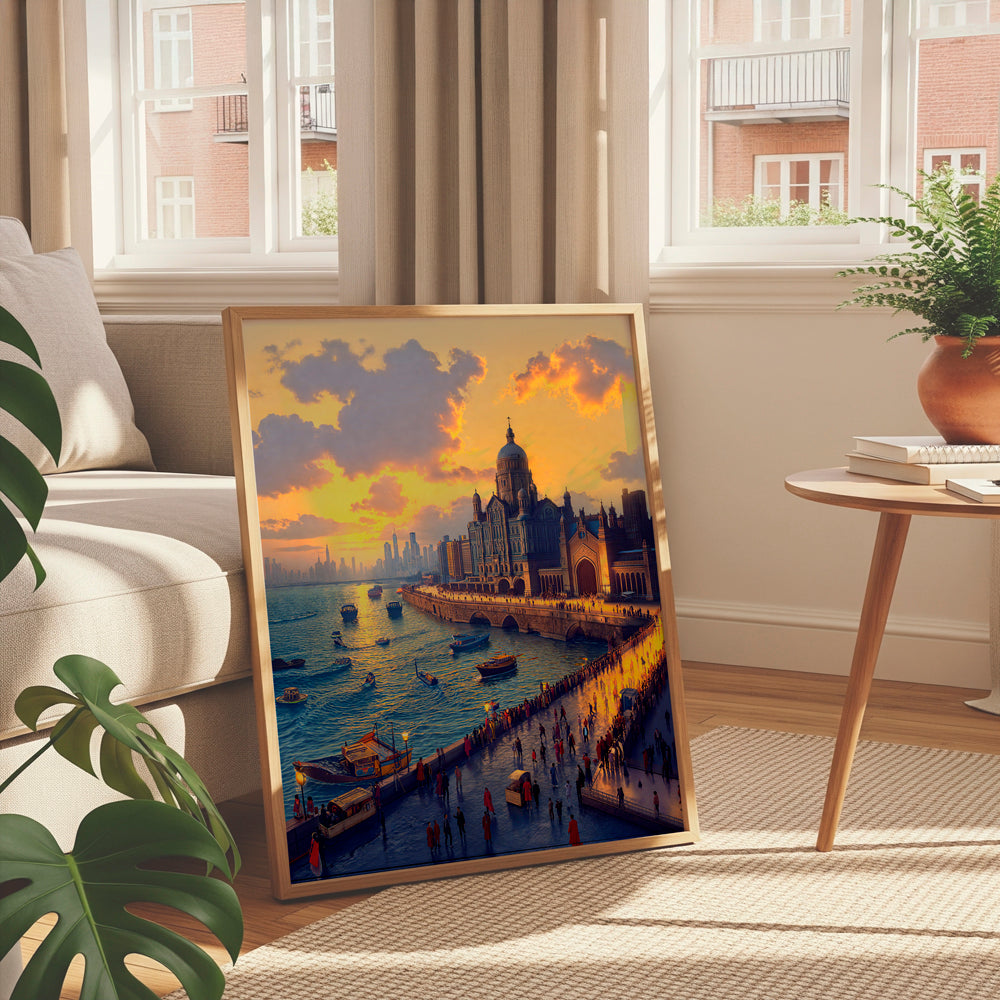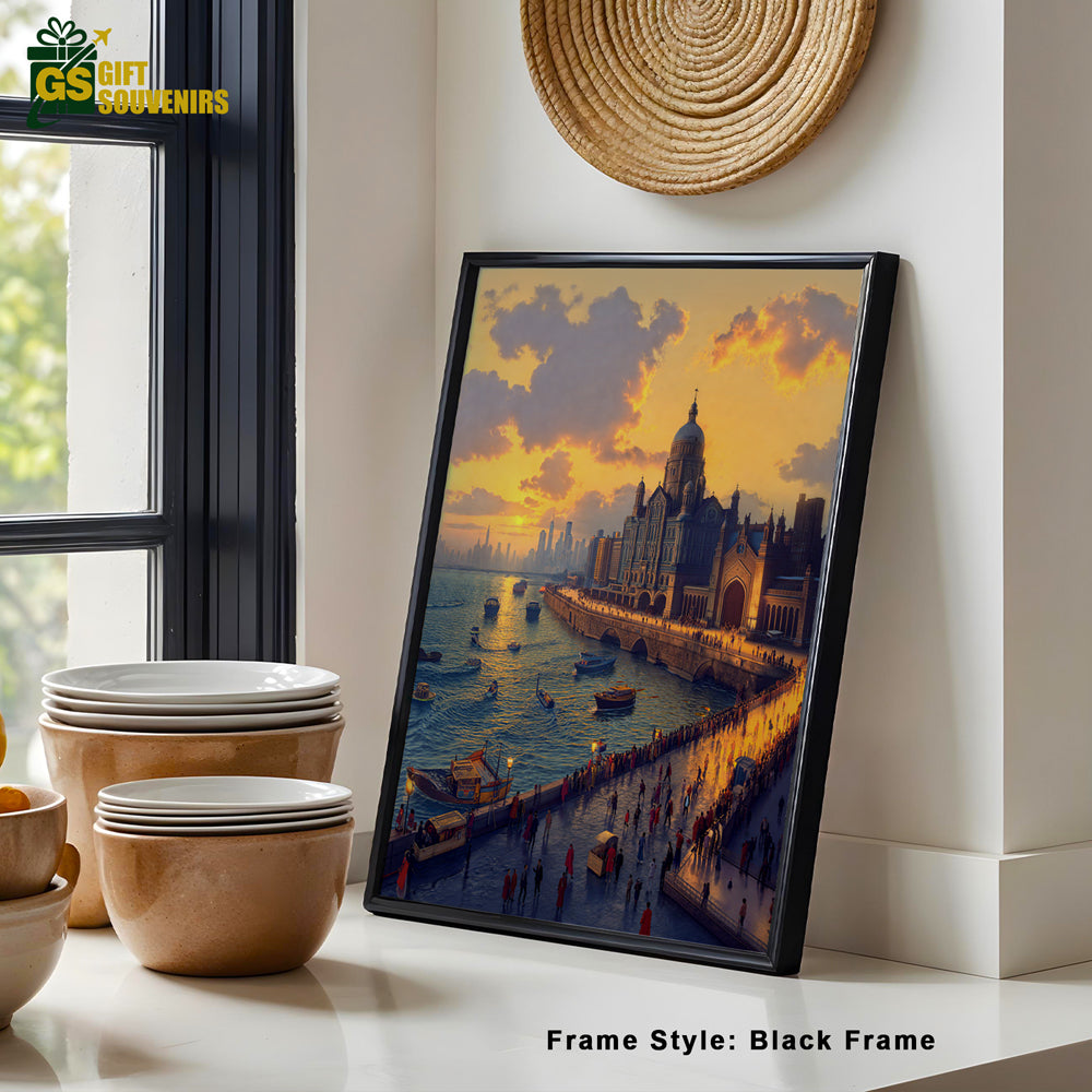Experience the golden glow of Mumbai with this stunning artwork of the Gateway of India at sunset. The vibrant sky, lively waterfront, and majestic monument together capture the city’s timeless charm and bustling spirit. A perfect addition to your home décor or a meaningful gift for those who cherish Mumbai’s heritage.